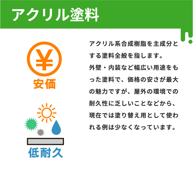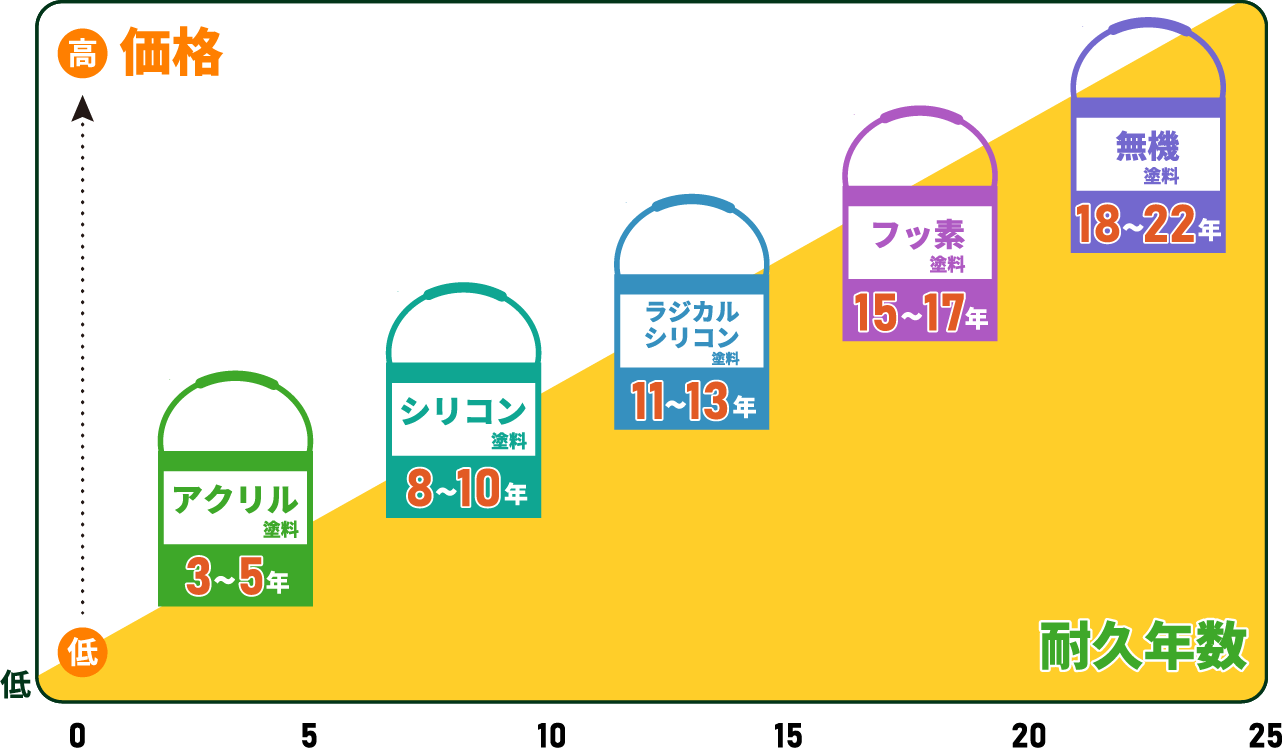 塗装に使う塗料は種類が多く、金額も様々。塗料を選ぶ際は耐久年数に注目しましょう。