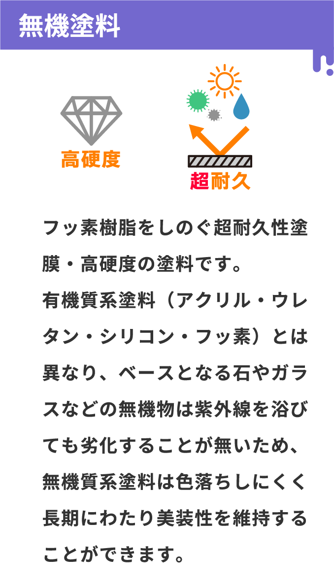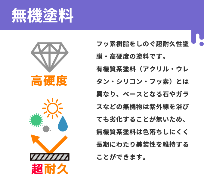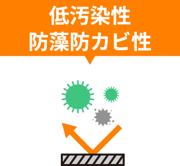 藻やカビの発生を防ぎ、塗膜の表層に特殊なコーティング技術を与えることで、汚れが付着しにくい塗膜にします。